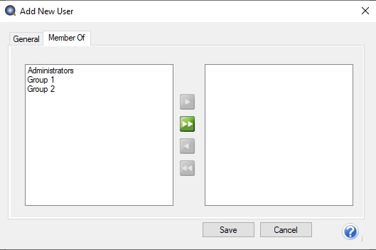 4. If you have existing User Groups that this user should belong to, select the Member Of tab, select the groups that have access to the functions for this user, and click the right-arrow icon to move the users from the left-side of the screen to the right-side of the screen. Multiple users can be selected by holding the Ctrl key at the same time a user is selected.