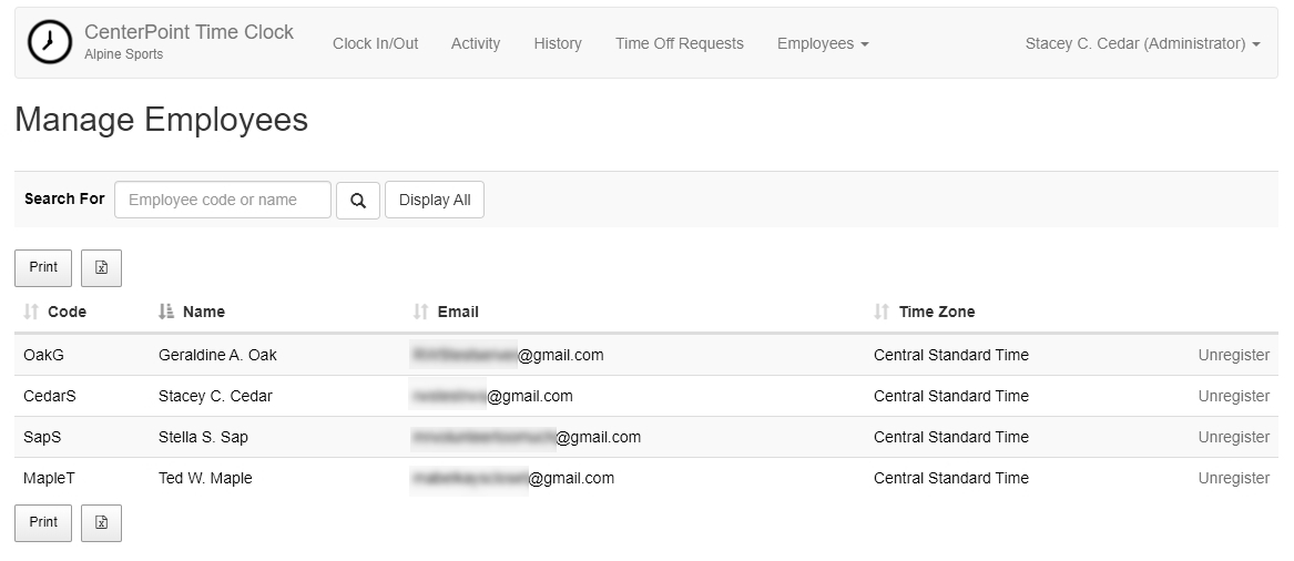 If you use the CenterPoint Time Clock website or the CenterPoint Time Clock app, first enroll your employee(s) in the CenterPoint Employee Portal, provide them with your Company Code and their Employee Code, and have them register on the CenterPoint Employee Portal website Then either continue to use the CenterPoint Time Clock website without using the CenterPoint Time Clock app or use both simultaneously.