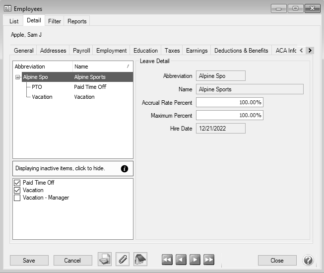 - If you do not want to display this leave as available to calculate or add to new employees, unselect the Active check box.