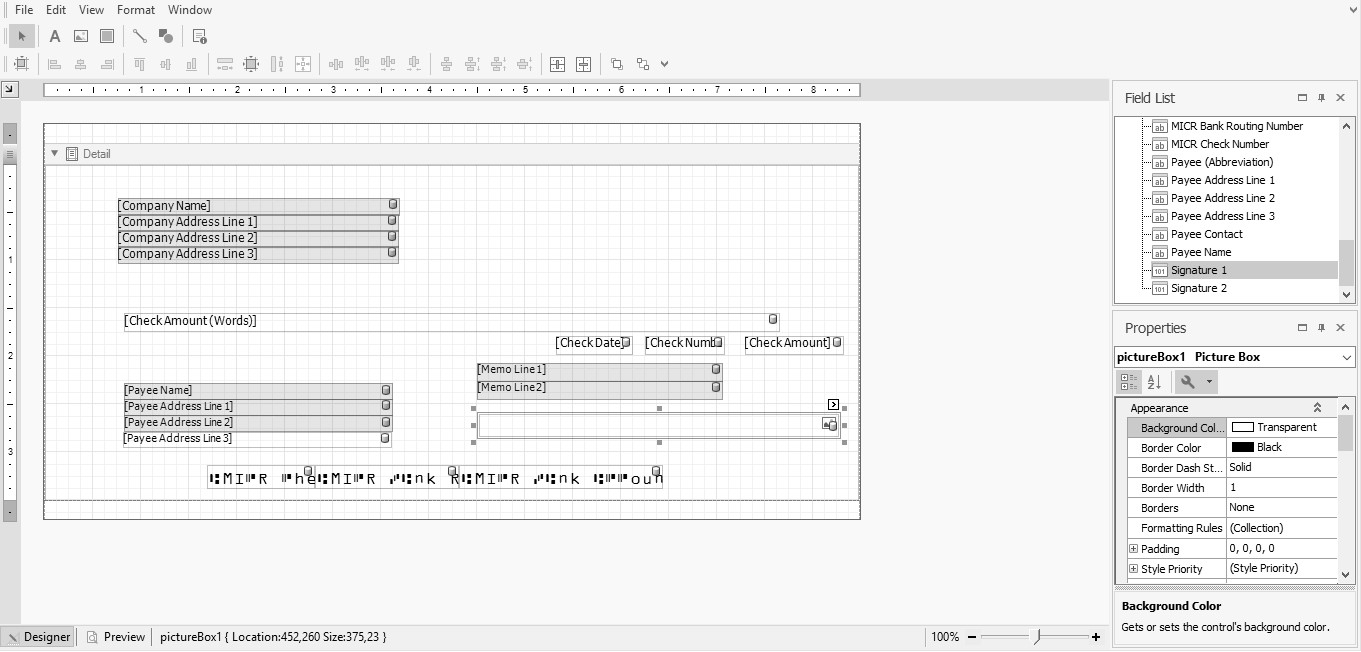 - In the upper-right side of the Check Form Designer, select Signature 1 and/or Signature 2 and drag the field to the place where you want the signature(s) to print on the check form.