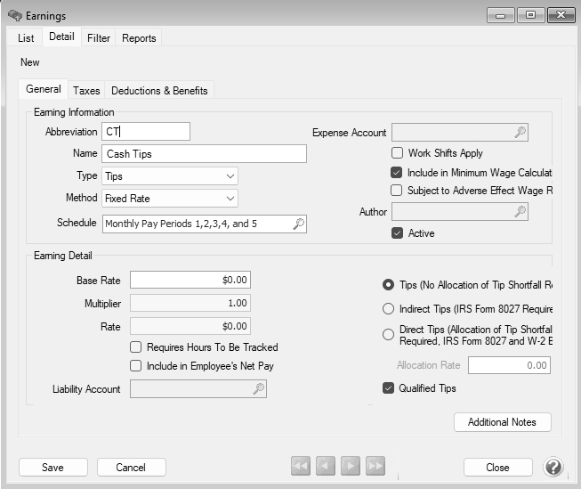 - Select the Taxes tab. Specify the taxes that should and should not be calculated on these tips. For more information on how to use the Taxes tab, refer to the Earnings topic.