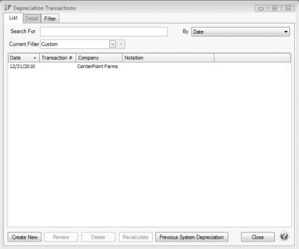 1. Select Processes > Periodic > Depreciation Transactions or Processes > Depreciation > Depreciation Transactions.