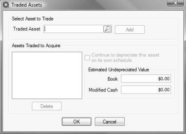 Click OK. The grid will display the Trade Amount (this is the total of the undepreciated book value of the assets that will not continue depreciating their own schedule but whose value is added to the new asset)