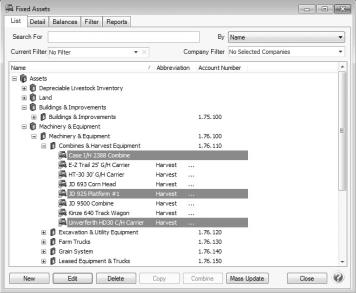 1. From the List tab, select the fixed assets you want to update. Multiple fixed assets can be selected by pressing the CTRL key while you make your selections.