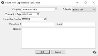 1. Select Processes > Periodic > Depreciation Transactions or Processes > Depreciation > Depreciation Transactions.