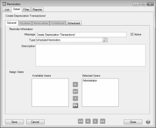 A scheduled reminder can be created if you would like CenterPoint to automatically remind you when depreciation transactions should be recorded,, follow the instructions below.