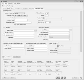 - Screen 3 - Setup > Accounts > Accounts > ACH/Direct Deposit tab (of the checking account used for Payroll).