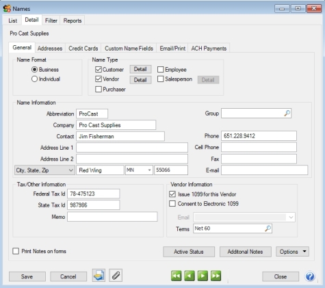 Names are individuals or organizations you do business with. There are four name types: Vendor, Customer, Employee, and Salesperson. Any name can be one, two, or all types. By specifying a name type, the transaction screens will display only the appropriate names for that screen.