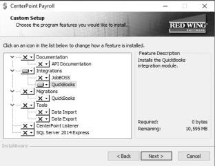 - Select the down-arrow under Integrations and next to QuickBooks, select Entire feature will be installed on local hard drive, and then click Next until the installation begins.