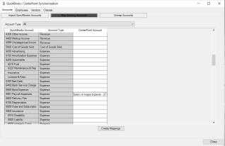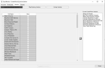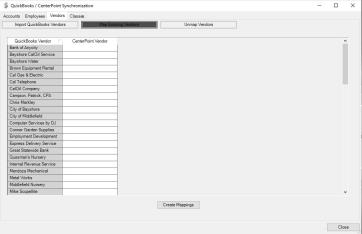 - In CenterPoint, the QuickBooks CenterPoint Synchronization screen displays. This screen allows you to keep the accounts, employees, vendors that are to be paid payroll liabilities, and QuickBooks classes (CenterPoint Profit Centers) that are used in payroll transactions in sync. Information created in Quickbooks can be imported into CenterPoint, or information created in both can be mapped. New information cannot be created in QuickBooks by using this process. This tool will also allow items previously mapped to be unmapped.