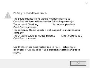 After the information in the message is corrected, for example by mapping the CenterPoint Checking account and Salary & Wage Expense to a QuickBooks account, the pay run can be reposted to QuickBooks at any time, see the To Repost to QuickBooks/Check Posting Log section below for more information.