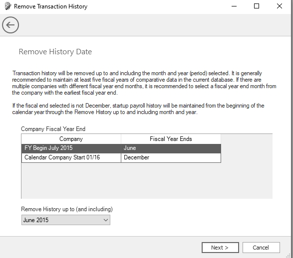 Historical transaction data can be removed from older, larger databases while maintaining open accounts receivable, accounts payable, customer deposits, prepaid vendor purchases up to and including the month and year (period) selected. It is generally recommended to maintain at least five fiscal years of comparative data in the current database. If there are multiple companies with different fiscal year end months, it is recommended to select a fiscal year end month from the company with the earliest fiscal year end. If the fiscal year end is not December, start up payroll history will be maintained from the beginning of the calendar year up to and including the selected month and year.