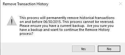 - Verify the transaction history removal date on the Remove Transaction History screen and confirm that you have a current backup. After the verification, click Yes to continue.
