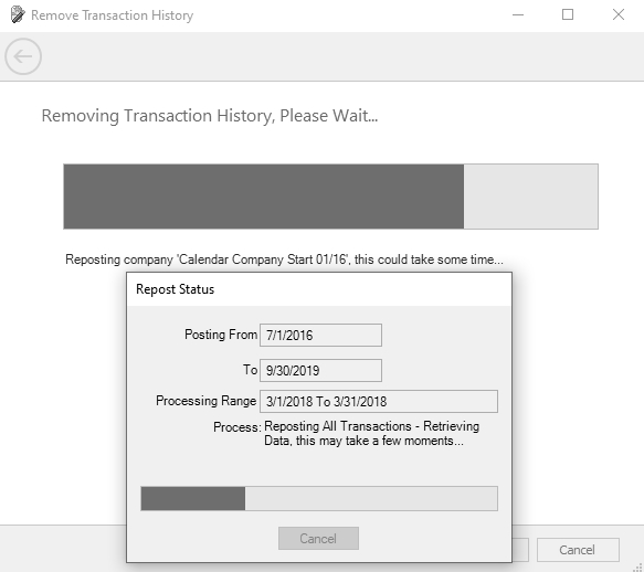 - The Removing Transaction History, Please Wait.... screen displays. The removal process make take some time based on the size of the database and the associated transaction data.