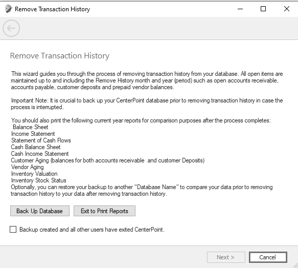 - Select File > Backup > Backup Database. Select the CenterPoint database the historical transactions will be removed from. and complete the backup.