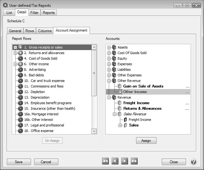 - Each time a new revenue, expense or cost of goods sold account is added (Setup > Accounts), we recommend you immediately assign the account to the appropriate row of the Schedule C.