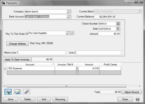 Note: If the Apply to Open Invoices field in the payment to be voided has a dollar amount, then this payment originally paid open invoices. After voiding, those invoices will be marked as unpaid and will again display on the Open Invoices and Vendor Aging reports. If the original payment was entered without applying it to open invoices (the Apply to Open Invoices field is zero) , then the void process will also void the expense portion of the check.