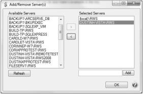 A: Normally this happens if exceptions (step 13 of the Server Installation instructions) were not setup or were not setup properly. Once the exceptions are completed properly, the server should be in the list. If it is still not available in the list, type in the server machine's IP address to add the machine to the Selected Servers list manually. Enter the address in the box next to the Add button with "\SQL Server used on the server" in the Add/Remove Server(s) screen (for example, 192.168.1.100\SQL Server used on the server), and then click Add.