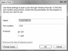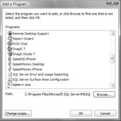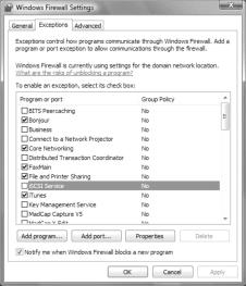 - Select Control Panel > Security Center > Windows Firewall > Change Settings (Microsoft Windows Vista) > Exception Tab.