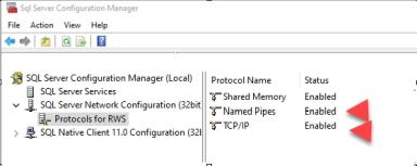 - Under SQL Server Configuration Manager, select SQL Server Network Configuration (32bit), and then select Protocols for RWS.