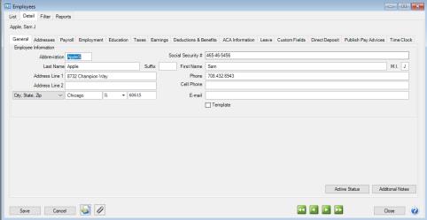 The General tab contains general information about each employee including their name, address, social security number, phone and cell number, and e-mail address.