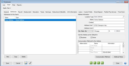• Under Use this Address as the Default for, select any combination of Business or Home to set this address as the default business or home address. Only one default business or home address (appears on the Setup >Employees > General tab) can exist. If a different address has already been set as the default, selecting a new default will change the default and override the previous setting.