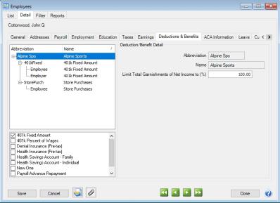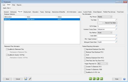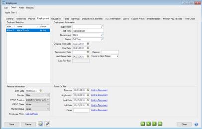 • Click Save to save the employee and return to the List tab, or click Close to save the employee and close the Employees screen.