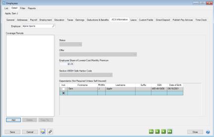 1. Click the ACA Information tab., and then click Add.