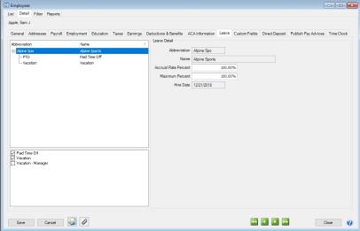 2. Select the employer in the box on the upper left side of the screen, the list displays only those employers for which the selected employee is currently active. In the lower left box, all active leave items display. Select which leave items pertain to this employee. Under Leave Detail on the right-side of the screen, there will be an Accrual Rate Percent box. This percentage will display 100%. The percentage can be overridden. If you seasonally reduce employees work schedules, you can reduce the leave accrual rate to a percentage of its normal rate and use the Maximum Percent field (set at the employer level on the Leave tab) to continue to accrue the total hours they earn, just at a reduced rate. For example, if Maximum hours is 80 hours and Maximum Percent is 80%, the Maximum field will display 64 hours. Both the Accrued Rate and Maximum hours will be displayed on the employee at the reduced percentage.