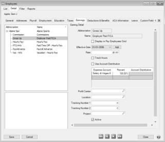 - Select the Employer Paid FICA earning from the upper list. The Earning Details will display to the right.