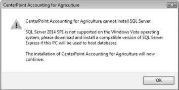 New CenterPoint Version 10 installations will install Microsoft SQL Server® 2014 Express which is not compatible with the Microsoft Windows Vista operating system. For new CenterPoint installations using the Microsoft Windows Vista operating system, please review the scenarios below to determine which applies to you.
