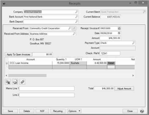 - Specify Commodity Credit Corporation in the Received From field. Specify the Date and Amount received from the loan.