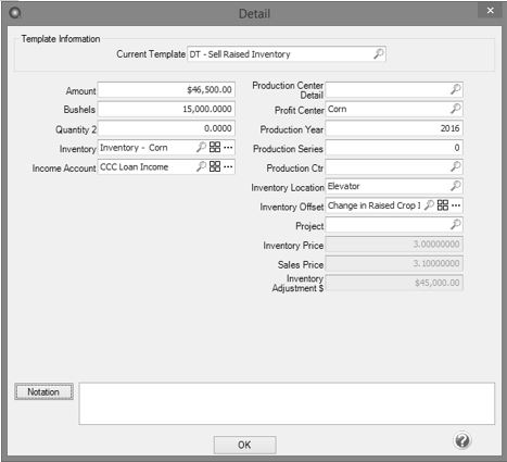 When the CCC corn is taken to the elevator and sold, a transaction will record the total sale of the corn in the Crop Sale revenue account. In the same transaction, the inventory is reduced and the redemption value recorded to the CCC Grain Redemption cost account. The cost account should be specifically for cost of CCC grain redemption. The cost will be assigned to the Schedule F expense line.