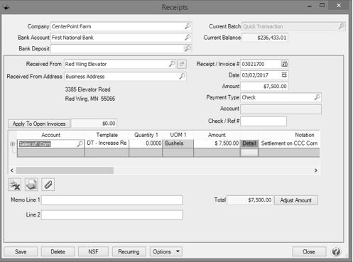 When the CCC corn is taken to the elevator and sold, the elevator repays the CCC Loan. When the initial loan amount is taken as income and the loan is repaid by the elevator, there is no need to record the loan repayment. The elevator sends you a settlement check. The check is entered as a receipt for additional revenue to the Crop Sales revenue account with no additional inventory adjustments.