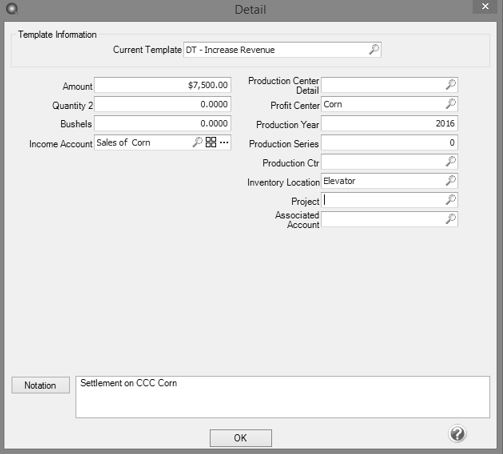- Select the appropriate Income Account and then specify the CCC Grain Redemption account in the Cost Account field.