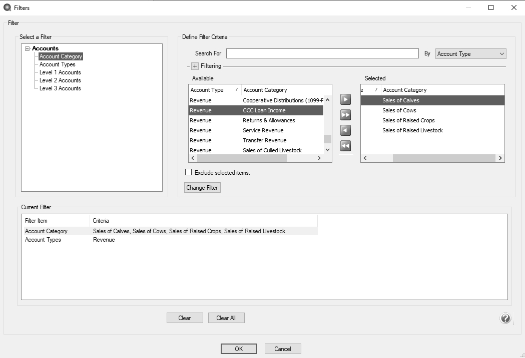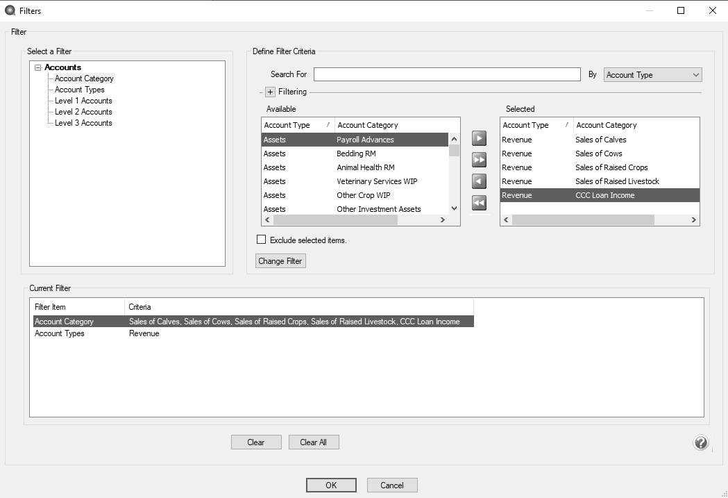 - In the Filters screen, select Account Category. Under Available, select CCC Loan Income.