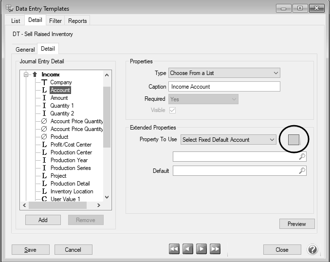 - In the grid, select the appropriate Raised Crop Inventory in the Account field. Then click on the Detail button.