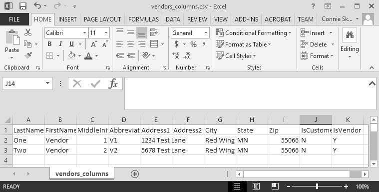 - The file must include all the data fields (columns) with (required) after the field definition. For example, for the Type of Import = Vendors the required data field (column) is LastName.
