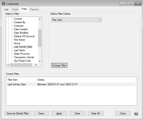 Follow the Filter the Contents of the List tab section to apply your filter to the default List tab. In the example below, the List tab was filtered to display the customers with a Last Activity Date of This Year.