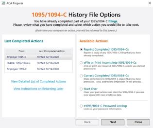 1. Upon completion of the ACA forms printing process, the ACA History File Options screen is displayed. If you are finished printing forms for the time being, select Close. This screen will also be displayed if the ACA printing process is started again.