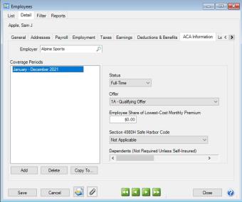 A: If you want your ACA employee counts to be accurate, you need to set up your part-time employees with ACA coverage periods. These employees can be set to not produce a 1095 but be included in the ACA counts by selecting Setup > Employees > ACA Information tab, on the left side of the screen add a Coverage Period, and then on the right side of the screen in the Status box select Part-Time and in the Offer box, select Not Applicable (No Form).