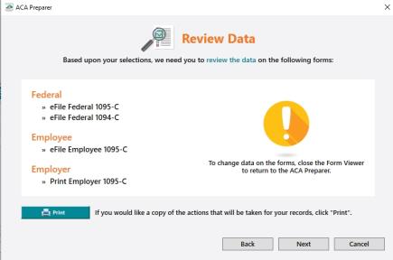 1. The Employer 1095-C will be displayed. To print this first form, click Print Copy/Final. You will be prompted to enter plain paper. Click OK. Once the data is printed, click Next Step to continue to the next selected form.