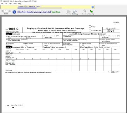 1. The Employee 1095-C will be displayed. Click Print Copy/Final. You will be prompted to enter plain paper. Click OK. Once the data is printed, click Next Step to continue to the next selected form.