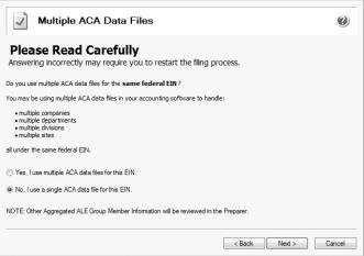 1. Start the ACA forms process and continue until the Multiple Payroll Data Files screen displays. On the Multiple Payroll Data Files screen, select Yes, I use multiple payroll data files for the EIN and click Next to continue.