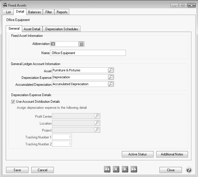 A fixed asset is a long-term tangible piece of property that a owns and uses in the production of its income and is not expected to be consumed or converted into cash any sooner than at least one year's time. In CenterPoint, fixed assets are setup separately from accounts, but are associated with a general ledger account. A benefit of fixed assets is the ability to view a detailed Balance Sheet without including the long list of individual assets. The fixed assets are summarized in their associated general ledger accounts.