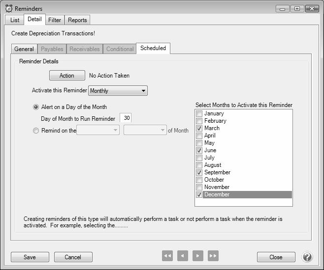 - In the Select Months to Activate this Reminder box on the right, select the months that correspond to the frequency selected in Step B. For example, if you chose quarterly, then select the last month of each quarter. If you chose annually, select just December.