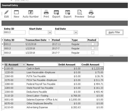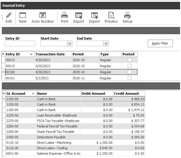 • If the File > Preferences > Payroll > General Ledger Posting is set to Summary (No Check Detail) or Detail (Employee Check Detail) and the File > Preferences > Interfaces > JobBOSS > Summarize is set to By Account, CenterPoint will post one journal entry to each account used in the pay run.