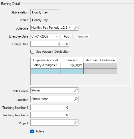 - Under Earning Detail (right), check the Active check box to activate this earning. Uncheck the Active box to deactivate the earning.