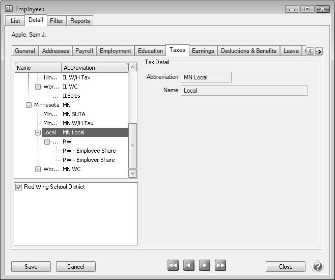 1. Open the Local folder found under the selected state. All local taxes will then be displayed in the box in the lower left side of the screen. Select the check box for each local tax to be assigned to this employee. Once selected, they will automatically display with the list of taxes for this employee. In our example, we selected Red Wing School District.