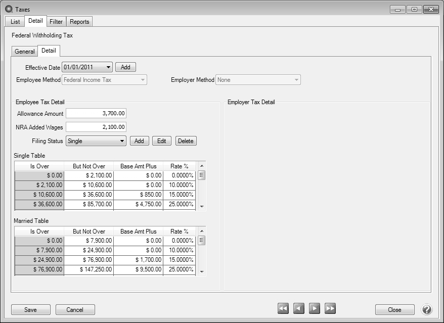 - Select File > Payroll Administration > Taxes. Using the appropriate Single or Married table, find the appropriate row for the adjusted annual wages calculated in Step 3. Document the Base Amt Plus, the Is Over and the Rate % from that row.